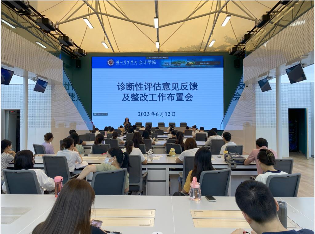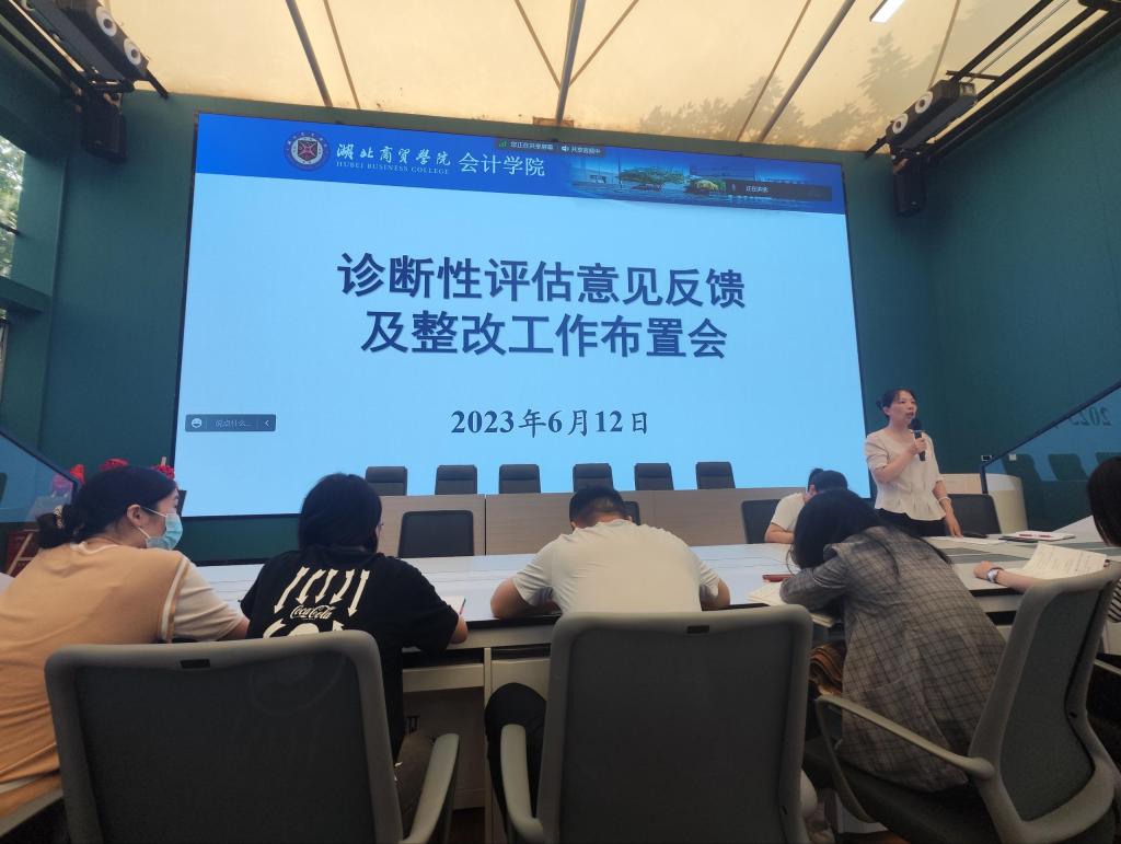 环球360官网于2023年6月12日上午8点10分在智能会计学习中心召开了诊断性评估意见反馈及整改工作布置会。环球360官网全体教师参加会议,咸宁校区的教师通过线上方式参会。会议的主要议程包括对6月5日至6月7日诊断评估期间专家提出的意见进行总体反馈,以及对下一步的整改工作进行布置。